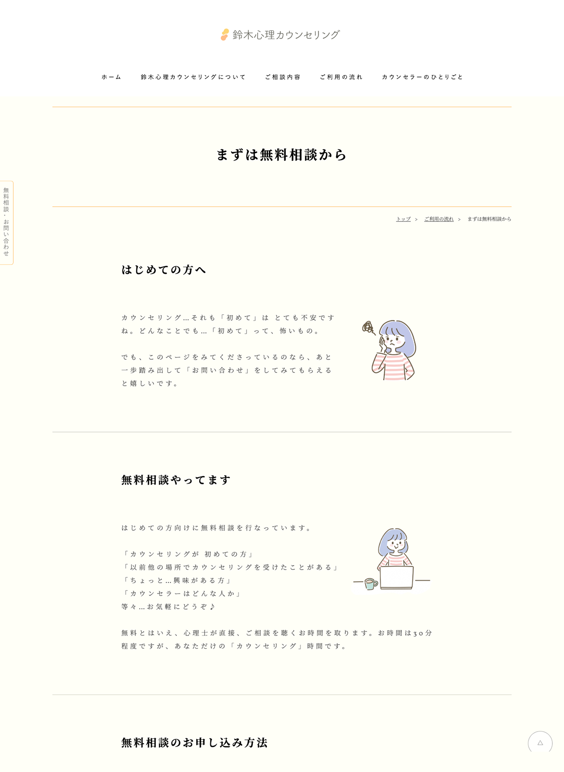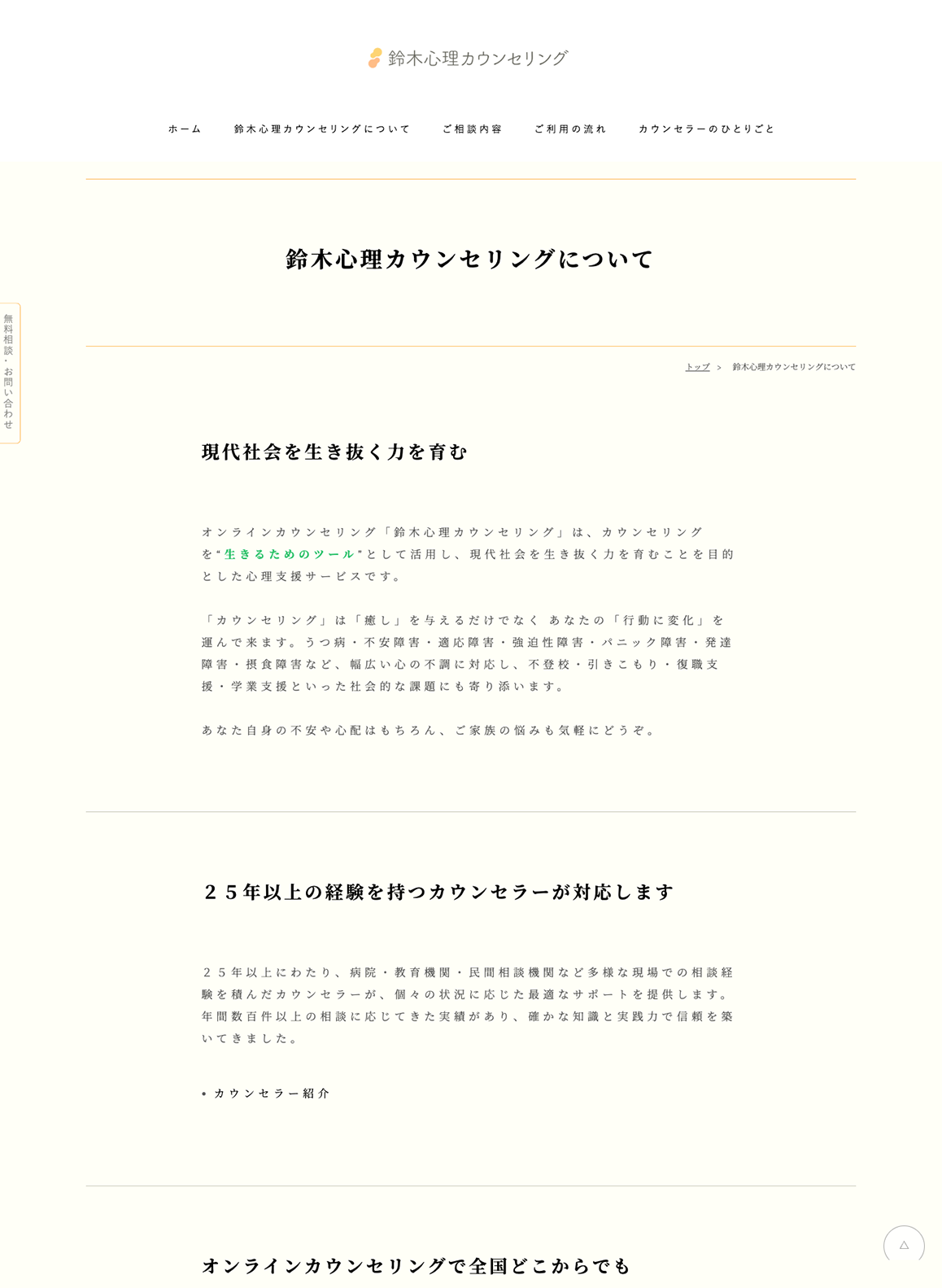 完成したホームページは、自分の想いが詰まった表現ばかり。専門用語を使わず、伝わりやすい言葉でまとめてくれたのがとてもありがたかったです。スライド写真の表情の選び方や色合いもイメージ通り。若い方からも「わかりやすい」「気軽に電話したくなる」と好評で、実際に体験カウンセリングの申し込みや問い合わせも増えています。