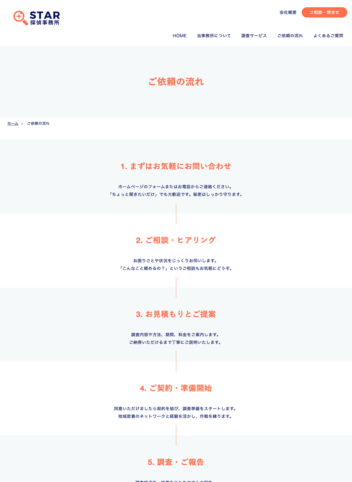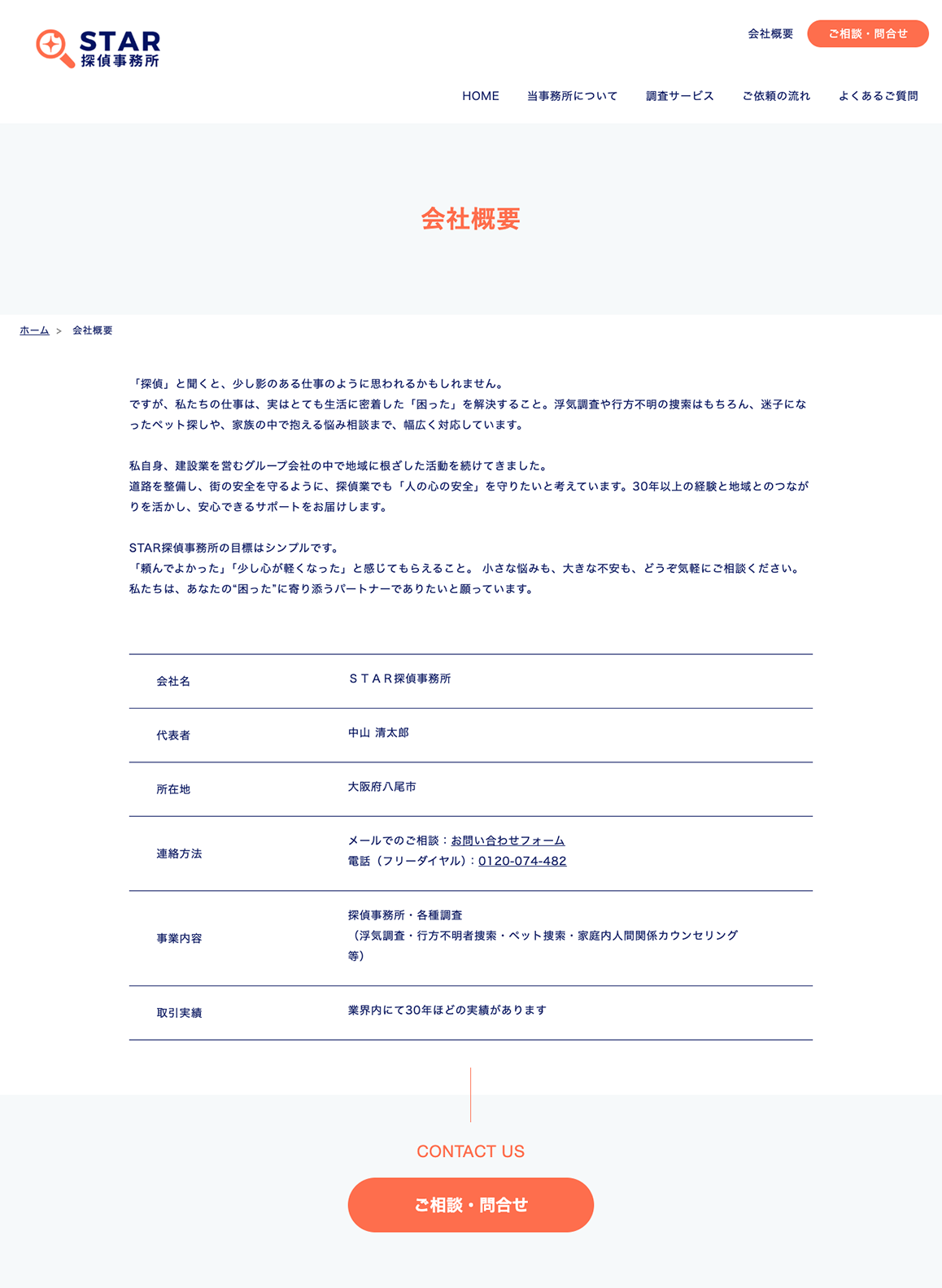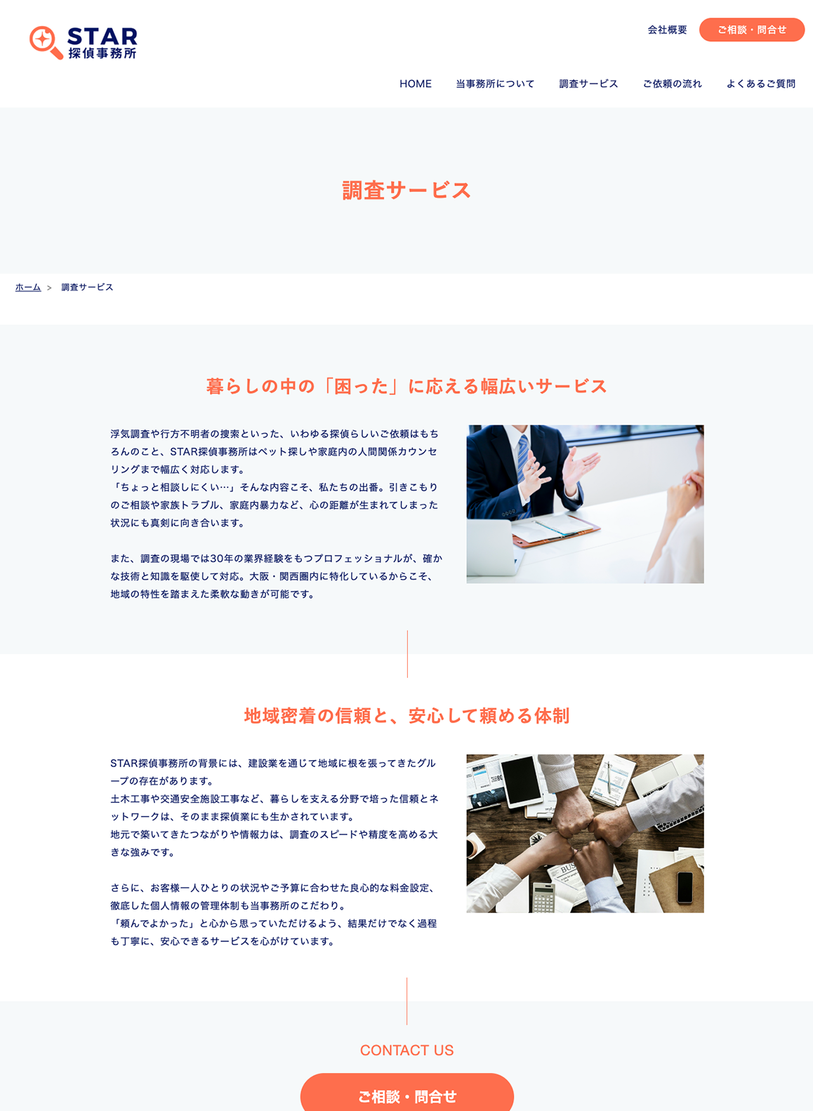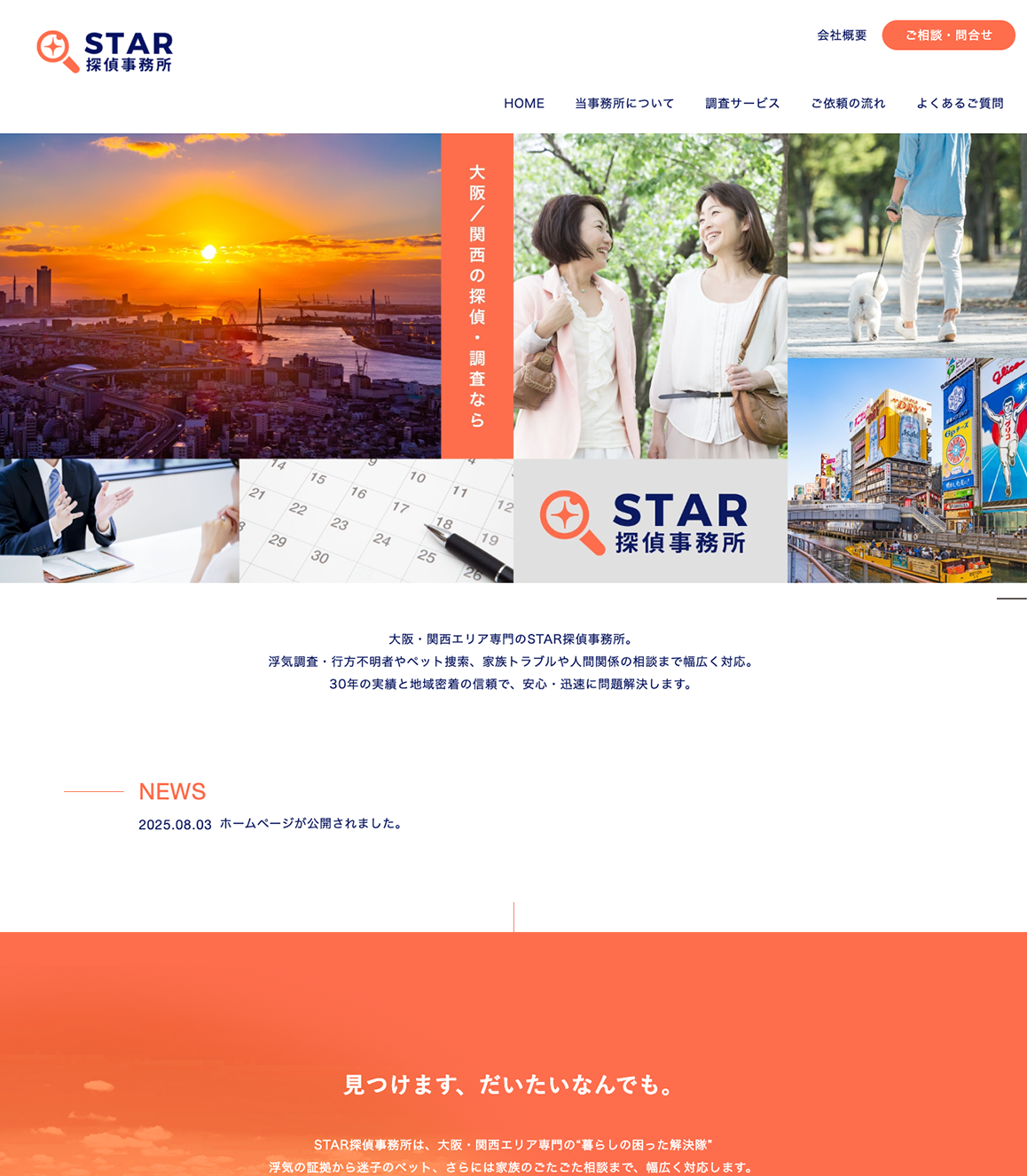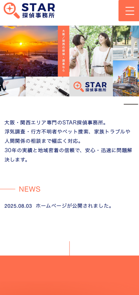 デザイン面では、「探偵=暗い・張り込み」といった従来のイメージから離れ、生活に自然に溶け込むような明るさを表現できました。清潔感のある仕上がりで、初めてホームページをご覧いただく方にも「相談してみよう」と思っていただける雰囲気になったと感じています。