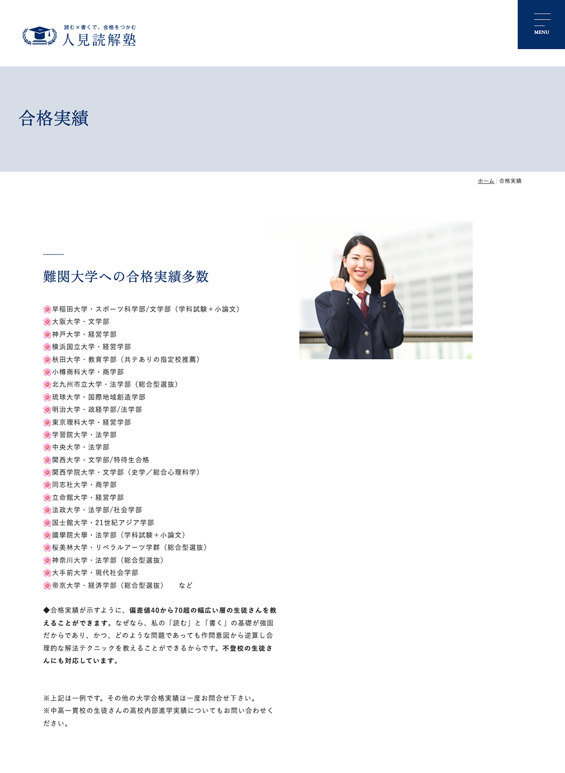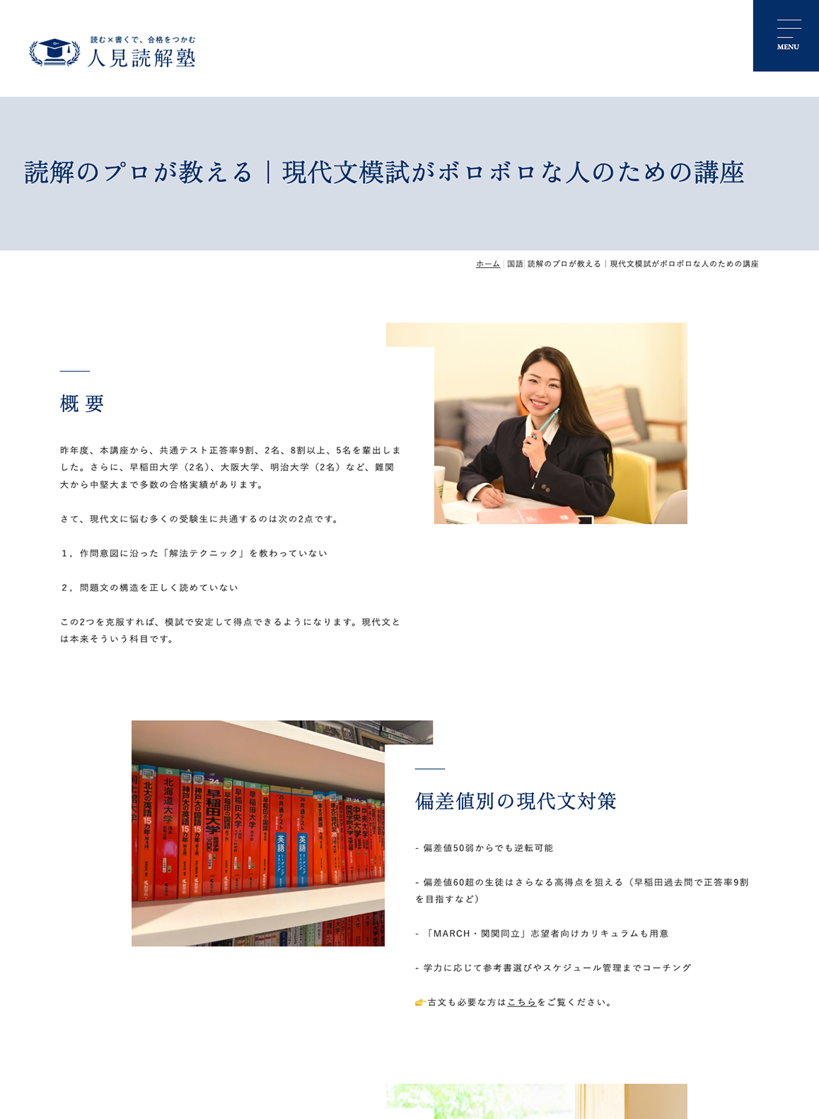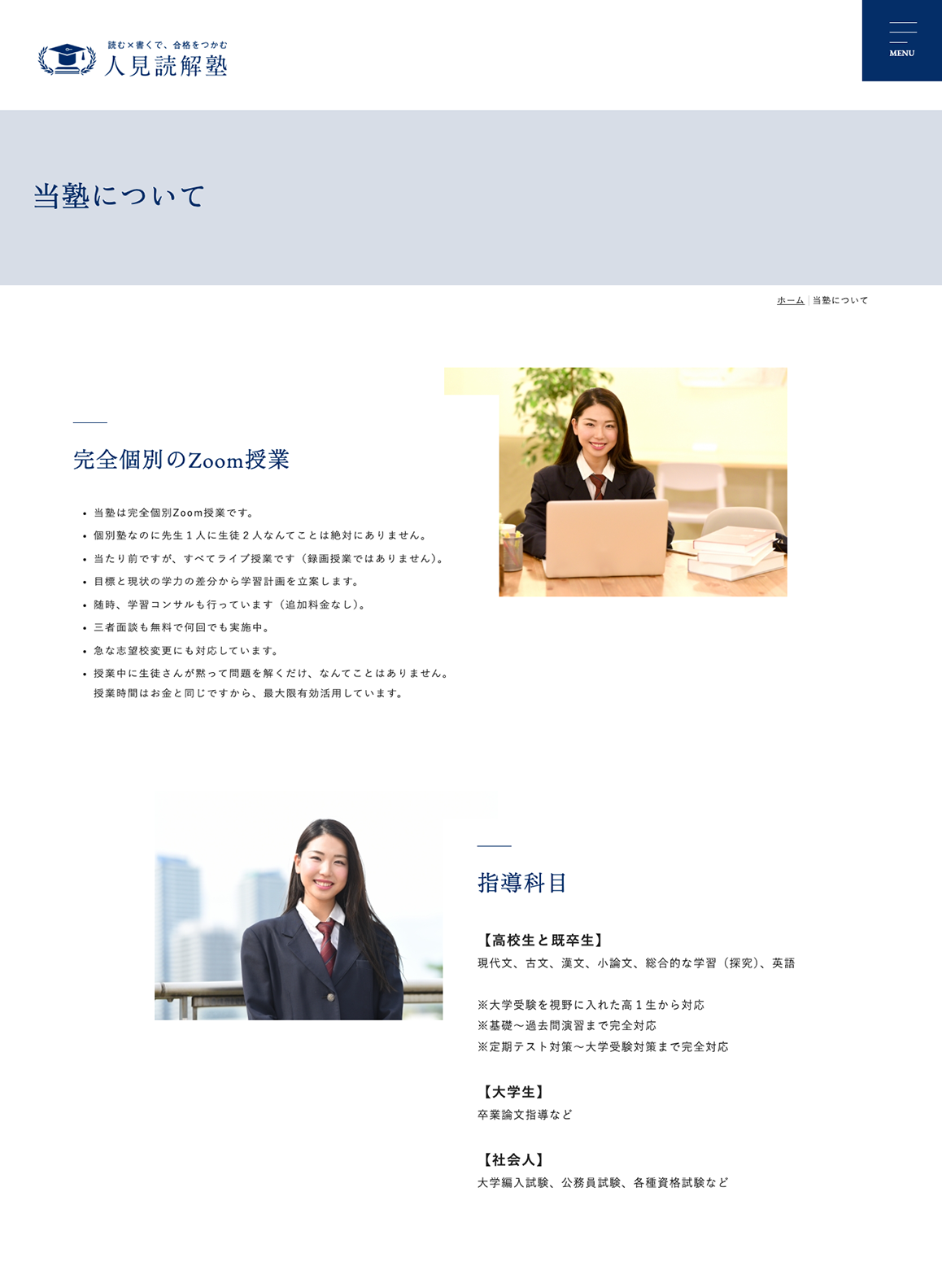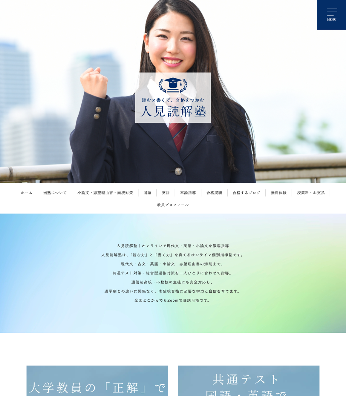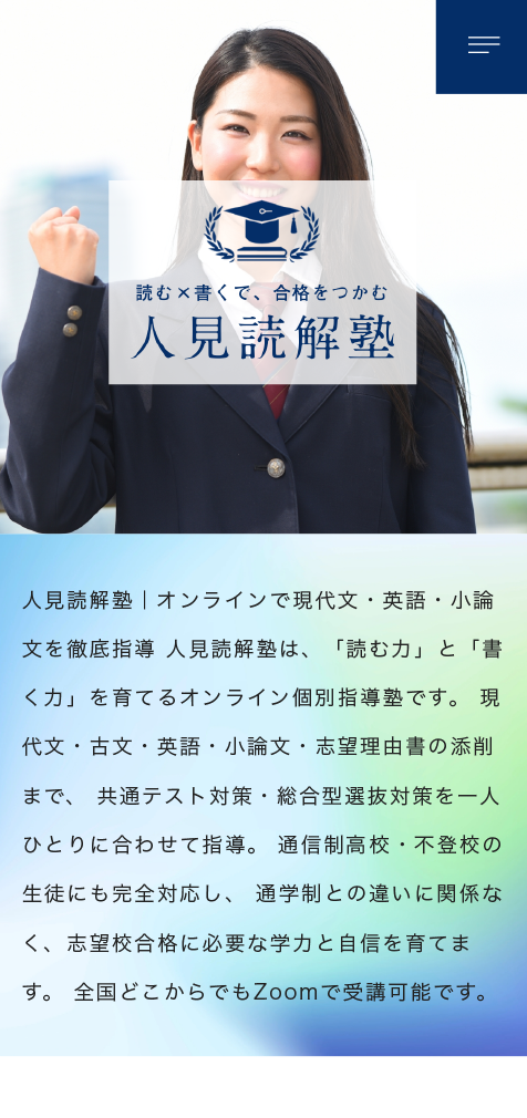 当塾は、大学受験と卒論指導に特化した「読む」と「書く」のオンライン個別塾です。常に30名ほどの生徒が在籍しており、今後も誠実に教育活動を続けていきたいと考えています。このホームページを通じて塾の方針や実績を丁寧に発信し、生徒や保護者の方に安心して選んでいただける場に育てていきたいと思います。