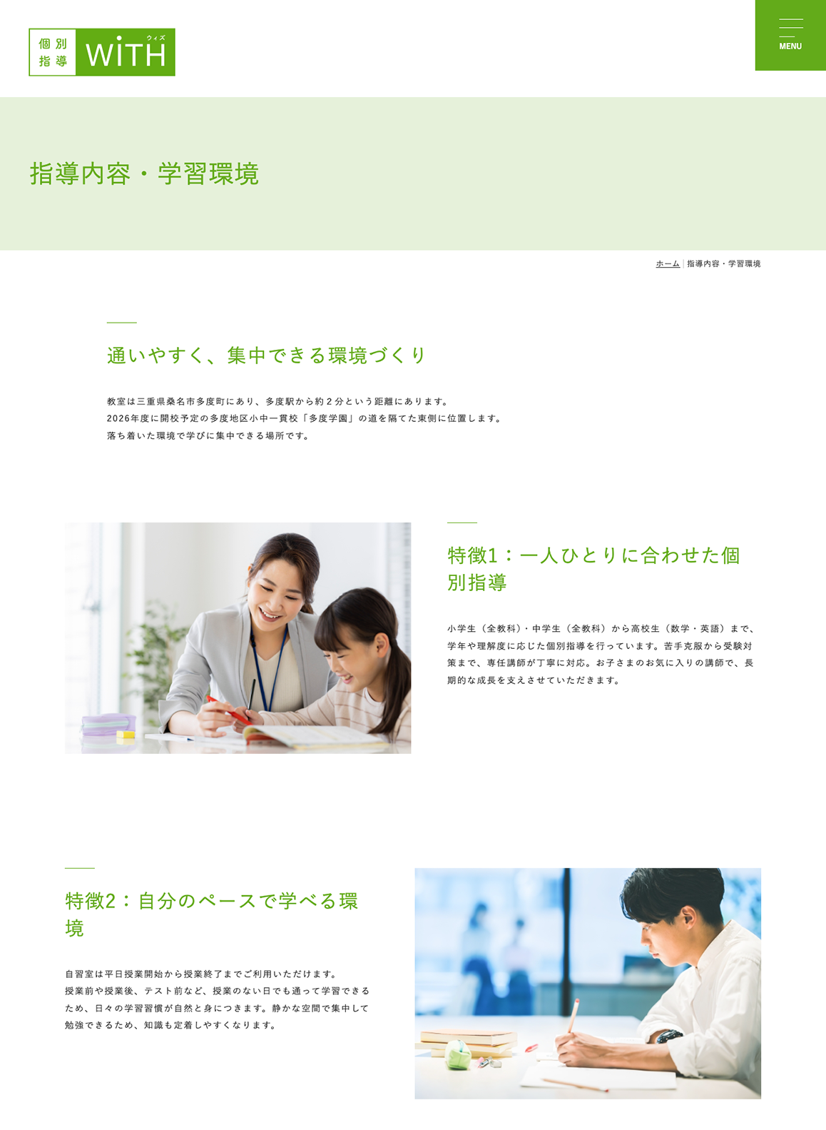 完成したホームページは、想像以上の仕上がりでした。トップページの画像が自動で切り替わる部分がお気に入りで、デザインが美しいだけでなく、見やすく惹きつけられる構成になっています。スマートフォンで見ても文字の大きさや配置がちょうど良く、保護者の方からも「見やすくて良いですね」と好評です。