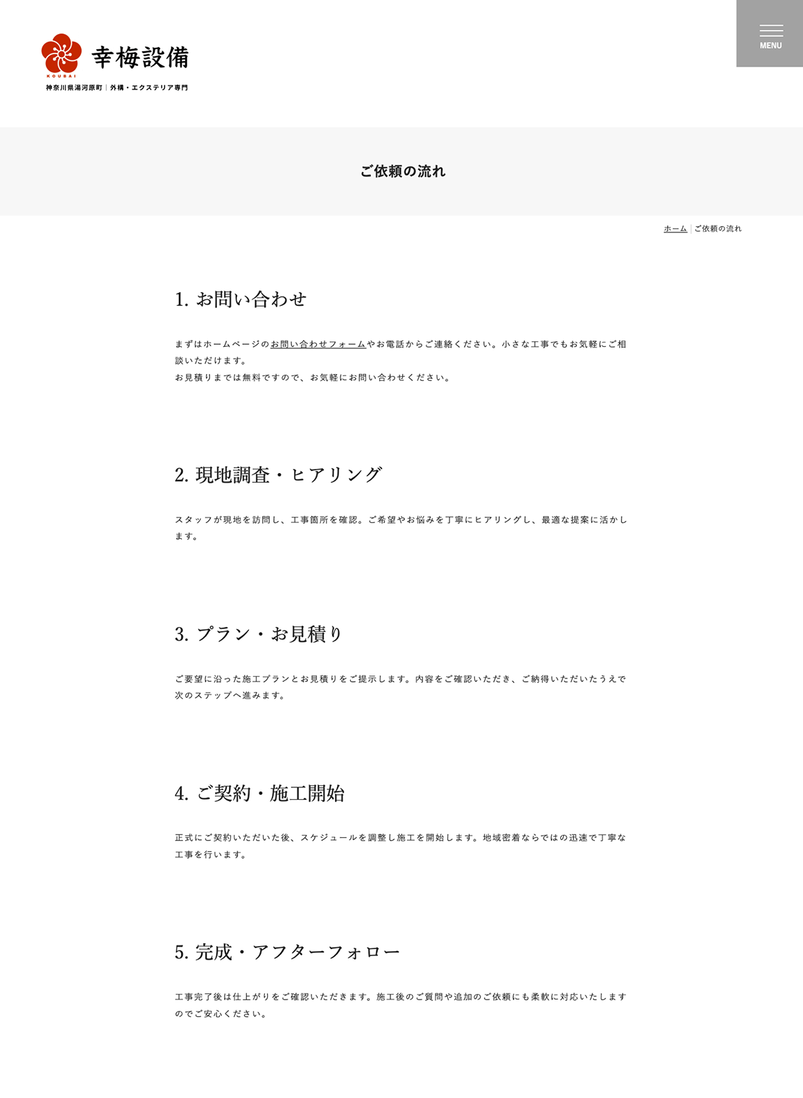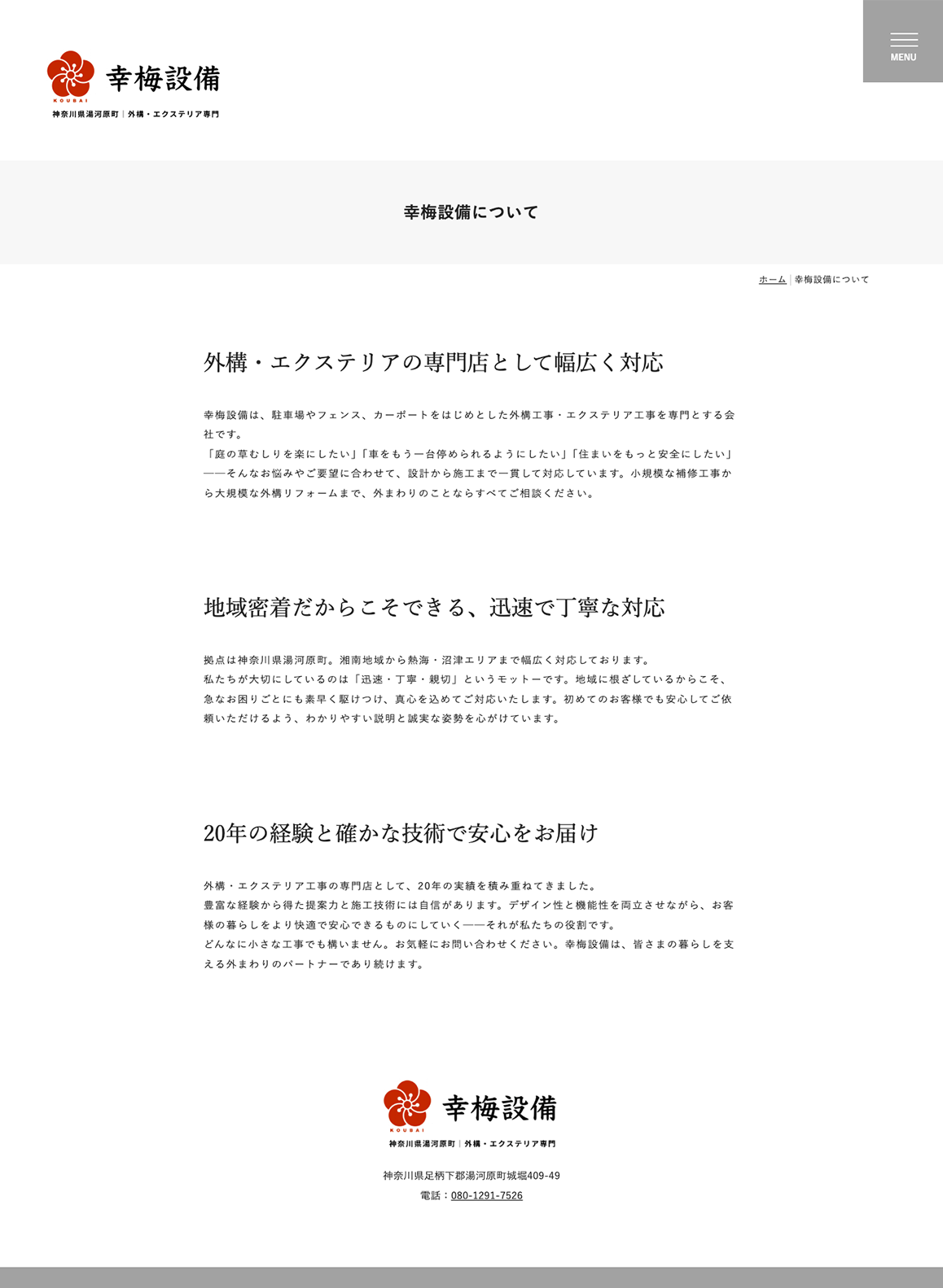 私たちは、外構・エクステリア工事を専門としています。今後はこのホームページを活用し、施工事例や私たちの考え方をより多くの方に知っていただきたいと考えています。これからも改善を重ねながら、集客につながる大切な窓口として育てていきたいと思います。