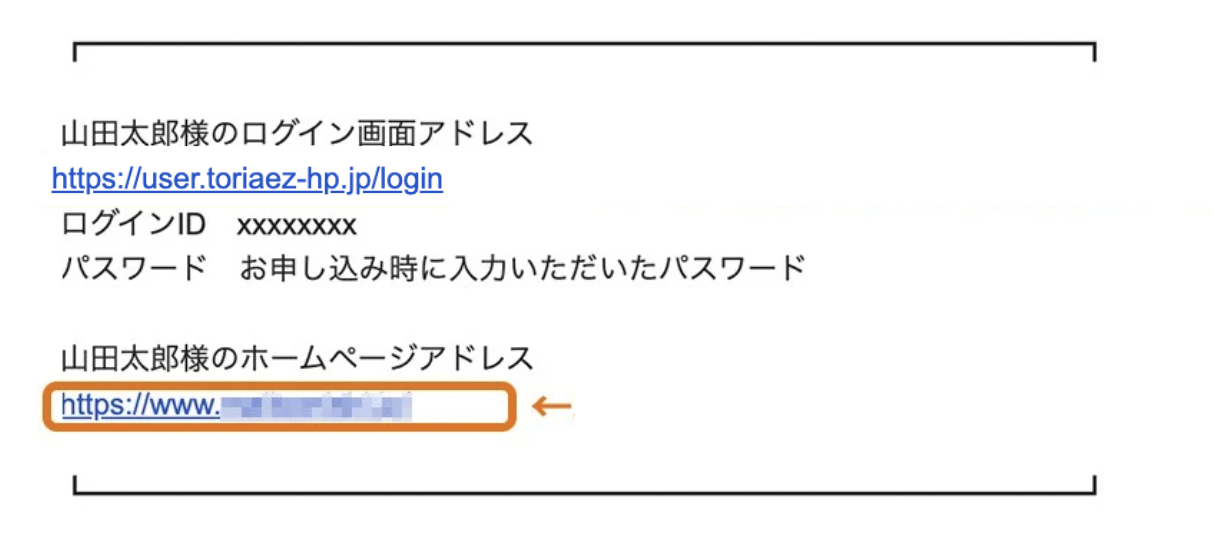 お申込みの際にお送りしている設定完了のご案内メールにあなたのホームページのURL(アドレス)が記載されています。