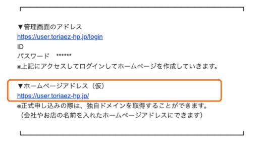件名「【とりあえずHP】正式申し込みの設定完了のご案内」のメール内の「▼ホームページアドレス」をご確認ください。