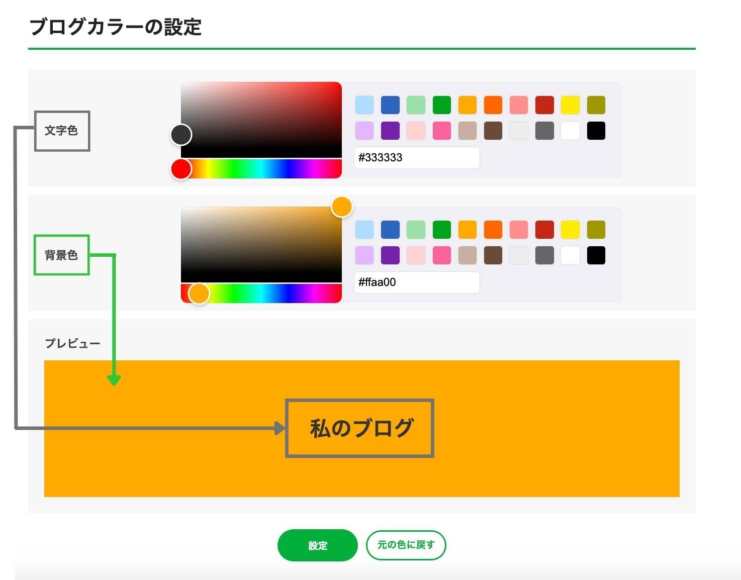 | 文字色:ブログページの上部に表示されるブログ全体のタイトルの色 背景色:ブログページの上部に表示されるブログタイトルの背景色 |