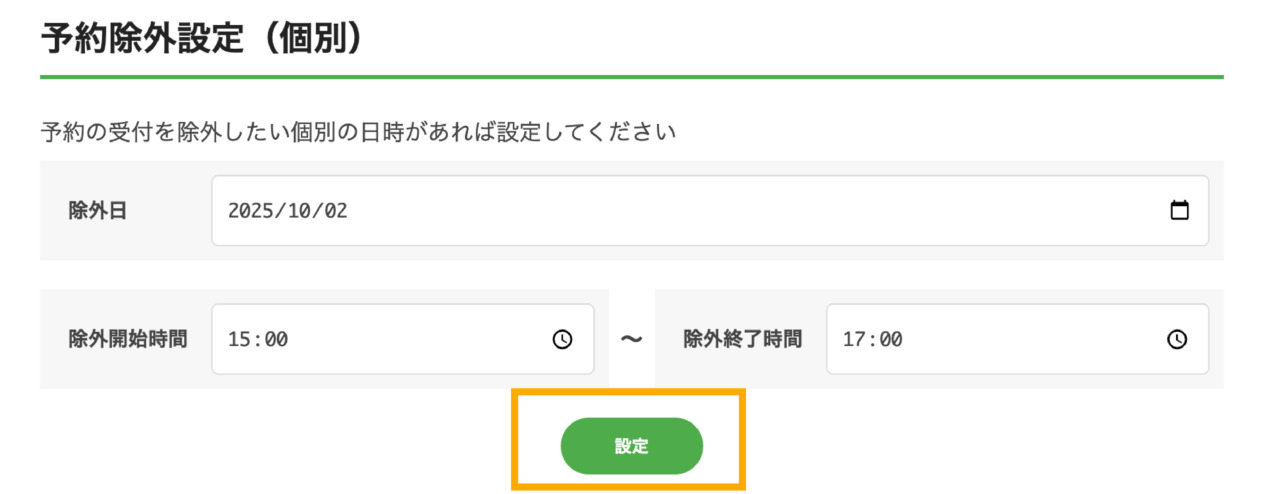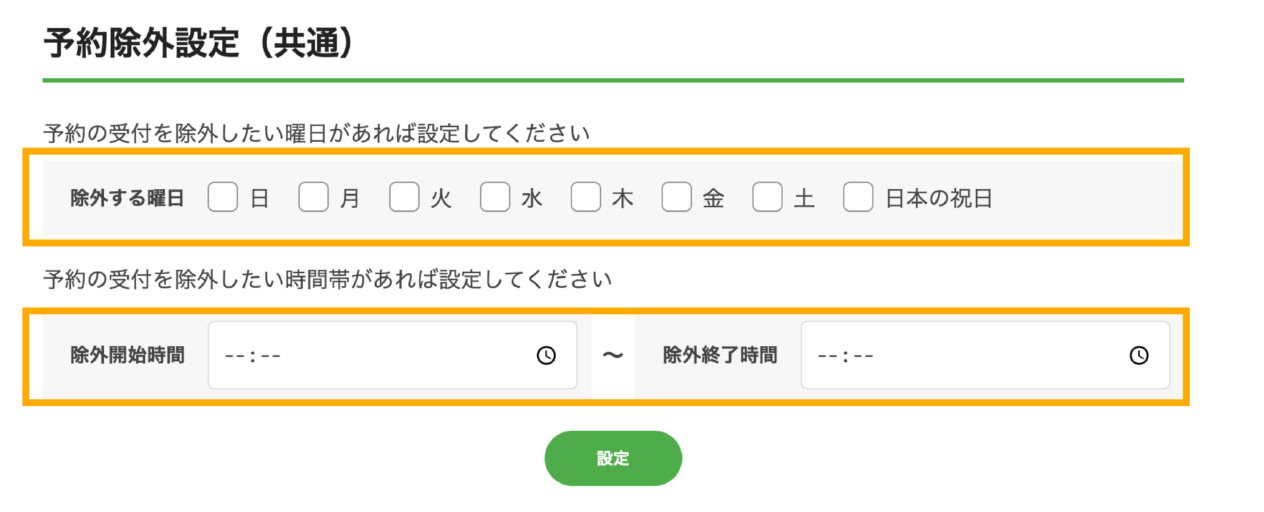 - 除外する時間帯:その日の中で一部だけ受け付けたくない時間帯を指定できます。