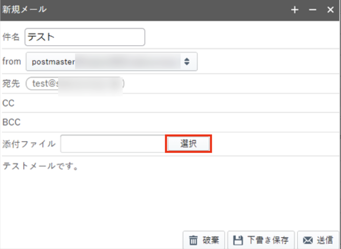 件名・宛先・メール本文を入力し、添付ファイル欄の『 選択 』をクリックします。