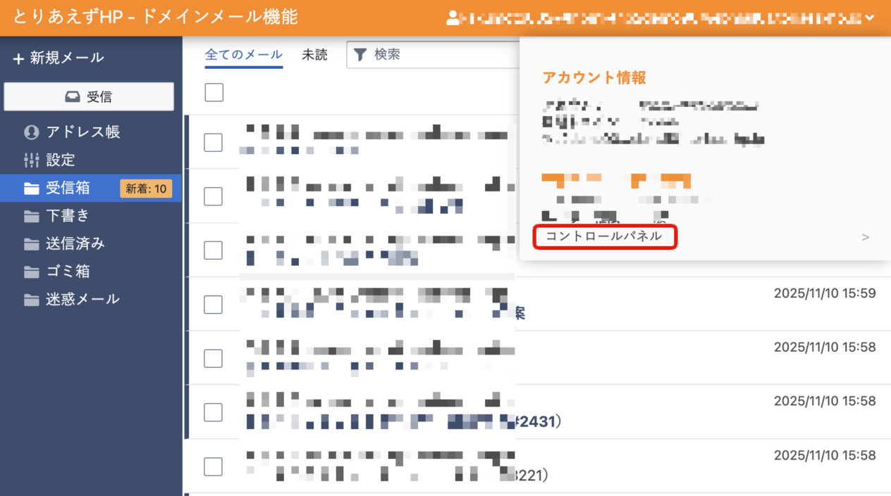 画面右上のメールアドレスを押下して「コントロールパネル」を選択してください。