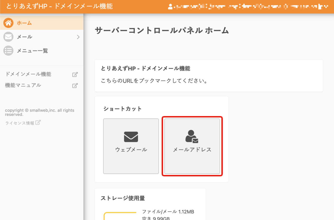 管理画面に移動したら画面中央のメールアドレスボタンを選択してください。