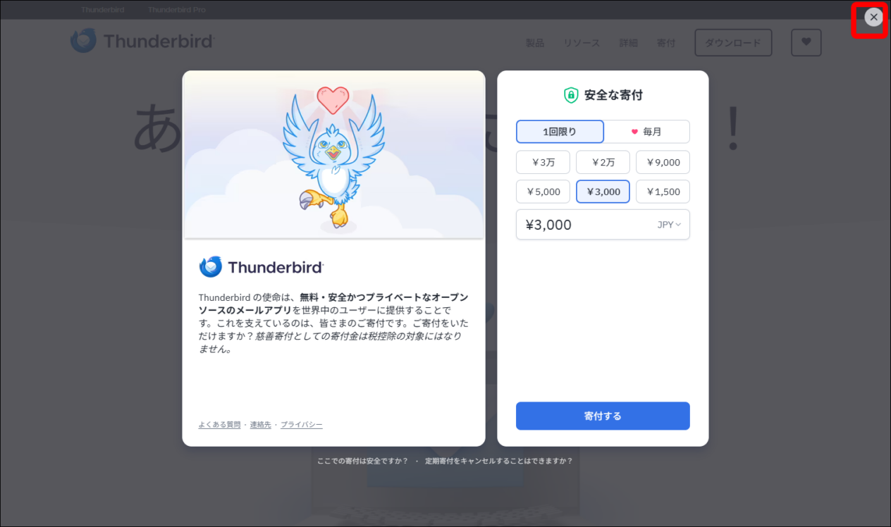ダウンロード時に以下のようなウィンドウが表示される場合、右上の「×」をクリックして閉じます。