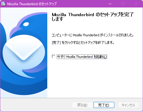 「今すぐMozilla Thunderbirdを起動(L)」のチェックを外して「完了(F)」をクリックします。