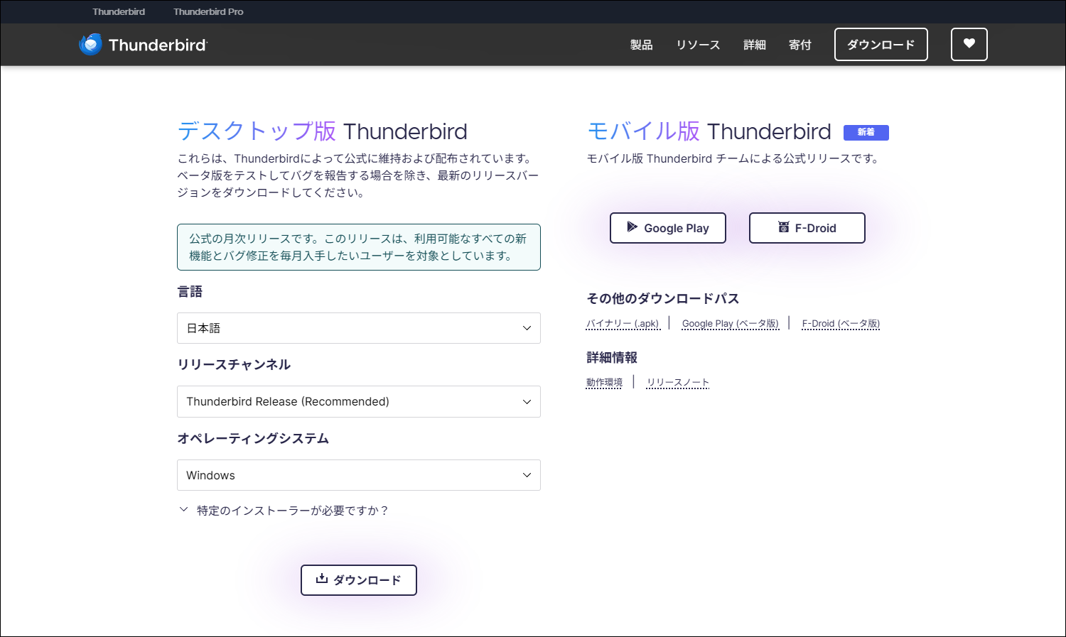 | リリースチャンネル | Thunderbird Release(Recommended) |
