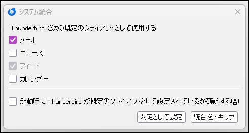 「システム統合」ウィンドウが表示されるので、「メール」だけにチェックを入れて「既定として設定」をクリックします。