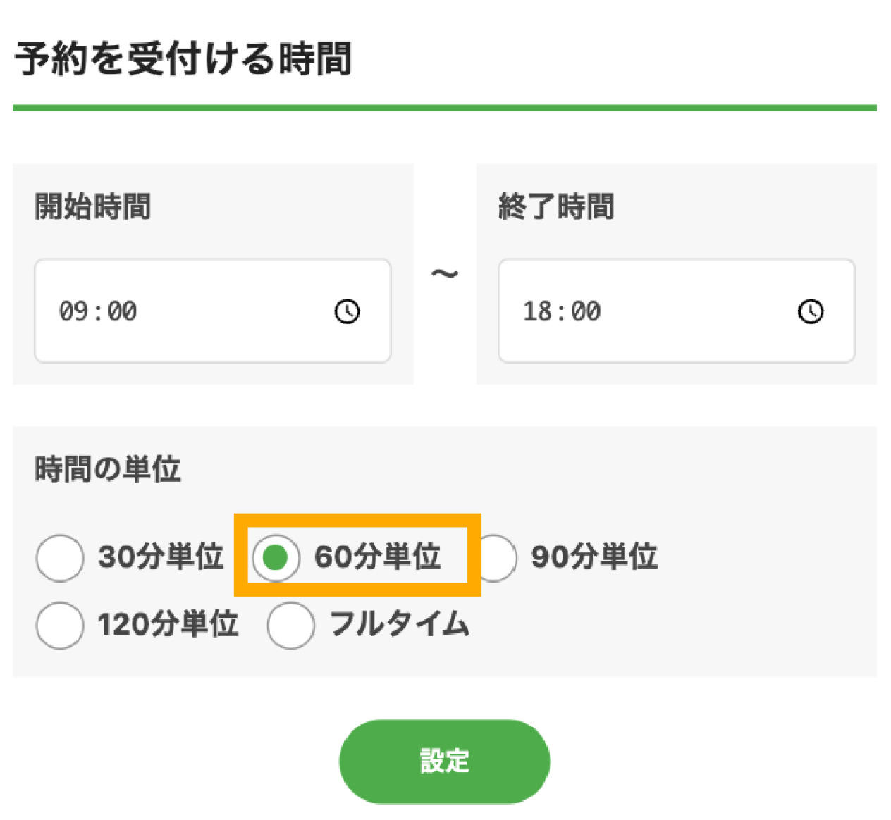 「9:00〜10:00」「10:00〜11:00」…「17:00〜18:00」といった1時間ごとの時間枠で予約受け付け可能