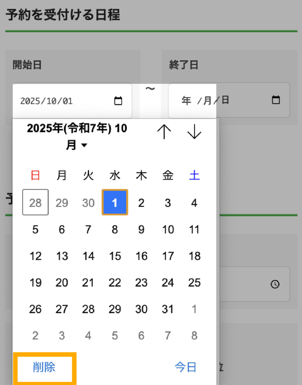 一度入力した日時を削除したい場合は、カレンダーの向かって左下にある[削除]をタップしてください。