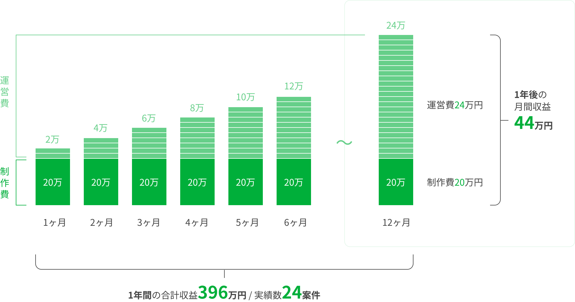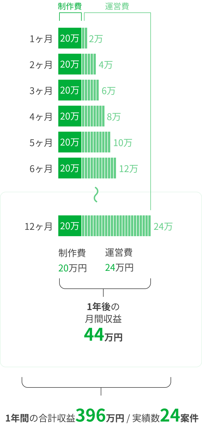 「制作費10万円の案件を月2件対応し、運営費を1万円/月で契約」とした場合の収益モデルを紹介します。